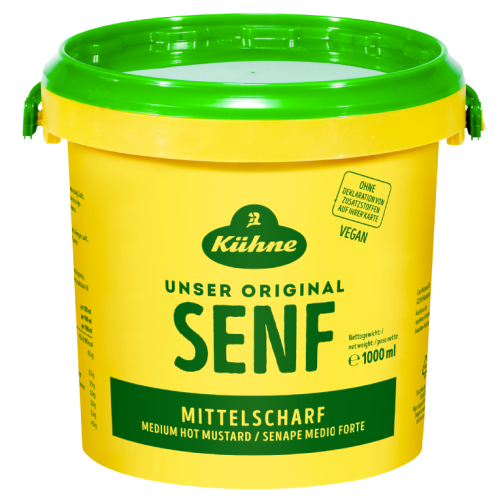 Unser klassischer, mittelscharfer Senf mit der typischen Kühne-Würzung und besonders cremiger Konsistenz ist in der praktischen Großpackung ideal für den professionellen Einsatz in Gastronomie, Catering und Großküche. Vielseitig einsetzbar zum Würzen und Verfeinern verschiedenster Speisen – von Grillgerichten bis hin zu Saucen und Dressings. Der praktische Eimer sorgt für eine einfache Handhabung, hygienische Lagerung und langanhaltende Frische. Hergestellt ohne Konservierungsstoffe und nach bewährter Kühne-Tradition – für besten Geschmack „Made in Germany“.